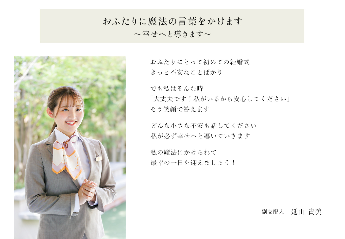 ミエルココンのスタッフはおふたりの専属プランナーだけでなく、 サービスからシェフまで全員が「すべてのお客様が自分の担当するお客様」という想いを共有しています。 それぞれの分野のスペシャリストたちがチーム一丸となり、 世界にひとつだけ、一度だけの特別な結婚式をお約束します。